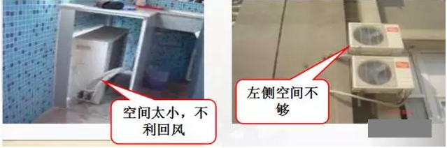 室外機(jī)安裝空間不夠,要求左邊 ≥30cm,右邊 ≥60cm,后面 ≥30cm,上面 ≥60cm,前面 ≥200cm。