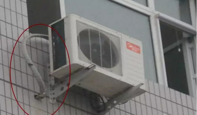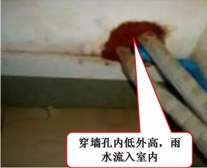 內(nèi)低外高,雨水流入室內(nèi),要求穿墻孔要傾斜,即室內(nèi)側(cè)必需高于室外側(cè),保證冷凝水能順利排出并防止凝露水順著配管流入室內(nèi)及雨水倒灌。