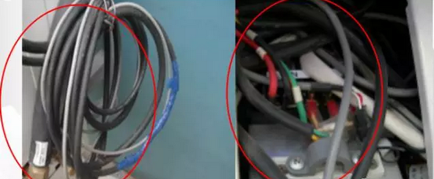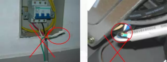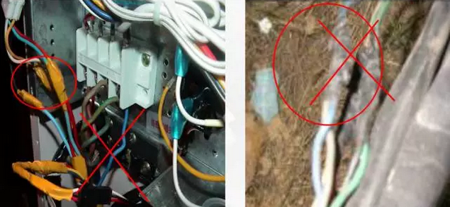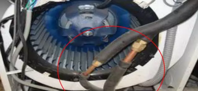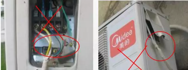 多余連接線線纏或隨意塞入室外機(jī)里面,會(huì)造成渦流發(fā)熱,發(fā)生意外 。要求多余的連線應(yīng)包扎在連管組合內(nèi),禁止把多余的線纏繞塞壓 。