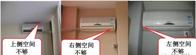 掛壁式分體內(nèi)機(jī)安裝位置不夠,要求左右兩側(cè)不小于12cm,上側(cè)不小于15--20cm,下側(cè)不小于200cm。