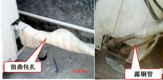 扭曲包扎或露銅管,要求包扎時(shí),連接線在上側(cè),連接管在中間,水管在下側(cè)的順序進(jìn)行均勻包扎,且連接管的管路應(yīng)分別進(jìn)行良好隔熱,按產(chǎn)品說明書要求選用獨(dú)立發(fā)泡的隔熱材料及適宜厚度(一般8~10mm厚)的護(hù)套,截止閥處露銅管不允許超過10cm。