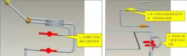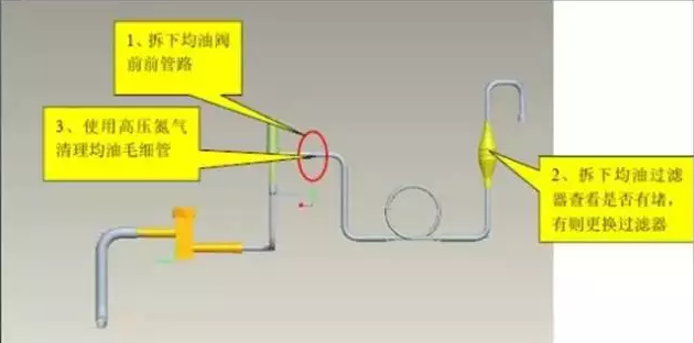 確認(rèn)完需要更換的零部件之后,需要確認(rèn)系統(tǒng)管路是否有異常,需要使用氮?dú)鈱?duì)主管路吹洗外,同時(shí)要重點(diǎn)檢測(cè)并清理油路系統(tǒng)。