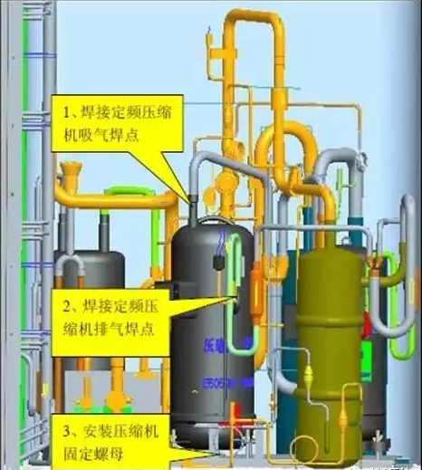 2、焊接完成管路系統(tǒng)后,需要使用墊腳和螺栓固定壓縮機(jī),保證壓縮機(jī)運(yùn)行時(shí)的穩(wěn)定性。