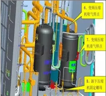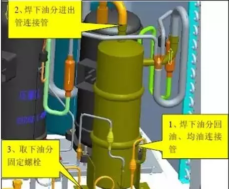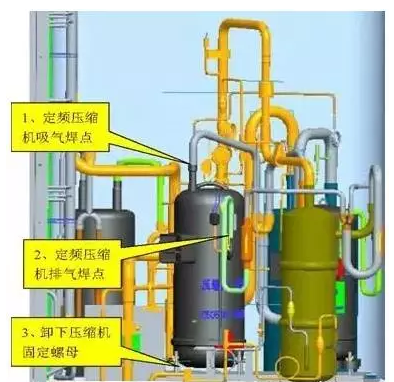 如果變頻壓縮機(jī)損壞,或者是定頻壓縮機(jī)內(nèi)油質(zhì)被污染時(shí),需要拆掉變頻壓縮機(jī),甚至更換油分離器和氣液分離器