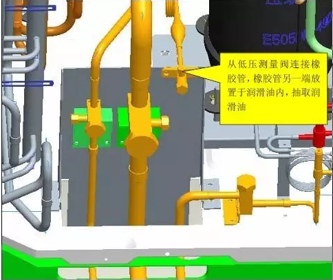 1、連接機(jī)組大小閥門,抽真空30min以上。使用橡膠管連接低壓測(cè)量閥,打開盛放潤滑油的容器,將潤滑油倒入量杯中量取合適的追加量。追加合適的潤滑油后,關(guān)閉低壓測(cè)量閥,保證密封。