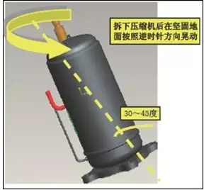 1、 拆下該壓縮機(jī)后,將該壓縮機(jī)在堅(jiān)固地面晃動(dòng),晃動(dòng)角度應(yīng)在30~45度之間(左圖),保證沉積在壓縮機(jī)底部的污染物能被倒出。