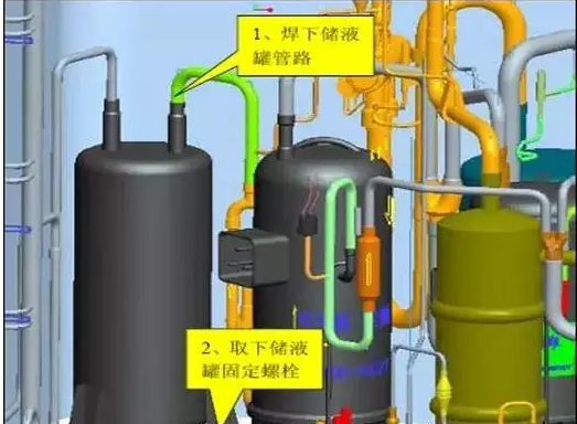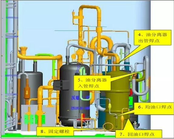 注意:要收集油分、汽分、儲(chǔ)液罐內(nèi)倒出的壓縮機(jī)潤滑油量,并做好相關(guān)記錄,方便更換壓縮機(jī)、汽分等原器件后,對(duì)系統(tǒng)進(jìn)行潤滑油的補(bǔ)充追加。
