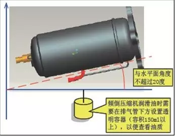 2、將壓縮機(jī)放置與高出水平地面的位置,從壓縮機(jī)排氣口倒油,倒油時(shí)要使用飲料瓶或其他透明容器儲(chǔ)油,收集油量應(yīng)大于150ml。注意壓縮機(jī)軸向位置與水平面角度不應(yīng)超過20度。