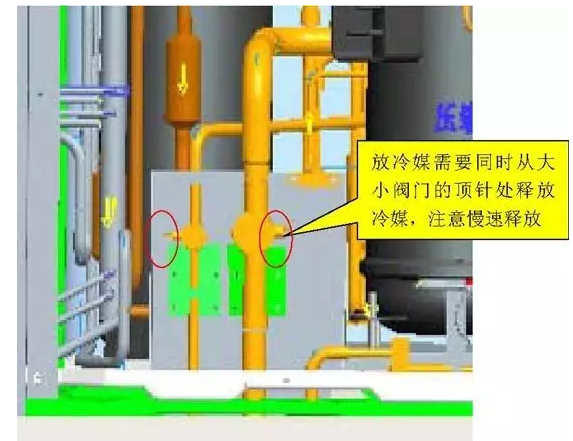 釋放系統(tǒng)的制冷劑,應(yīng)該同時(shí)從系統(tǒng)高壓側(cè)和低壓側(cè)釋放制冷劑,如果僅從一側(cè)放氣,渦旋盤密封會(huì)導(dǎo)致制冷劑釋放不完全。釋放制冷劑的速度不宜太快,否則會(huì)有大量的潤滑油被制冷劑一起帶出系統(tǒng)。