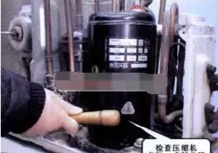 一般選擇木錘或者就地選擇可用物件。在壓機啟動時重錘敲擊其身上的三個焊點。但要注意力道,不能敲變形。輕輕地敲擊壓縮機外殼,把卡住部位稍微振松,有時可啟動運轉(zhuǎn)或把電源電壓往上調(diào)高10%,多次啟動沖擊,這個方法可解決潤滑不夠的卡缸現(xiàn)象,對旋轉(zhuǎn)式壓縮機特別有效。