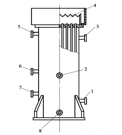 1—出液管;2—壓力表接頭;3—進(jìn)氣管;4—配水箱;5—安全閥接頭;6—均壓管;7—放空管;8—放油管