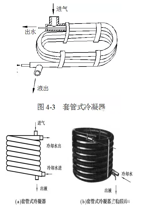套管式冷凝器:它是由不同直徑的管子套在一起,并彎制成螺旋形或蛇形的一種水冷式冷凝器。如圖所示,制冷劑蒸氣在套管間冷凝,冷凝液從下面引出,冷卻水在直徑較小的管道內(nèi)自下而上流動(dòng),與制冷劑成逆流式,因此傳熱效果較好。