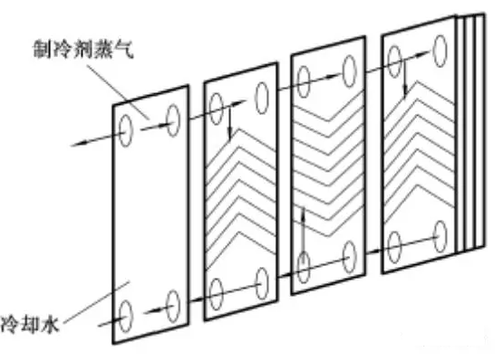 板式換熱器體積小,重量輕,傳熱效率高,所需制冷劑充注量少,可靠性高近年來(lái)得到廣泛應(yīng)用。但其內(nèi)容積小,冷凝后的液態(tài)制冷劑應(yīng)及時(shí)排除,對(duì)冷卻水質(zhì)要求高,難以清洗,內(nèi)部滲漏不易修復(fù)。