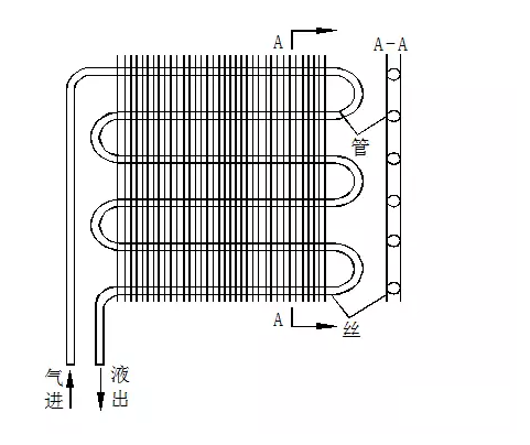 (1)空氣自由流動(dòng)的空冷冷凝器:該冷凝器利用空氣在管外流動(dòng)時(shí)吸收制冷劑排放的熱量后,密度發(fā)生變化引起空氣的自由流動(dòng)而不斷地帶走制冷劑蒸氣的凝結(jié)熱。它不需要風(fēng)機(jī),沒(méi)有噪聲,多用于小型制冷裝置。如下圖所示: