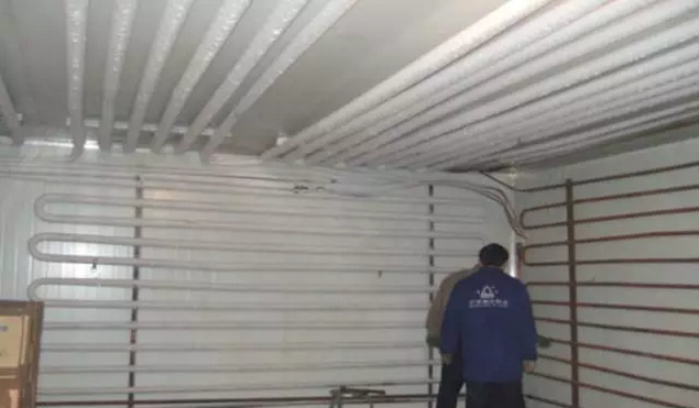 這樣不僅節(jié)省材料,換熱效率較高,而且如果使用無極調(diào)速的冷風機,可以通過改變風量來適應(yīng)庫內(nèi)負荷的變化。貨物剛?cè)霂炜梢匀龠\行,快速降低貨物溫度;待貨物達到預定溫度后降低轉(zhuǎn)速,避免了頻繁啟停造成的耗電和機器損耗。